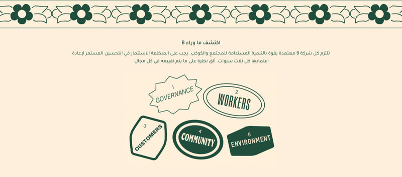 - يقوم هذا الختم الدولي بتقييم الشركات عبر خمسة أبعاد: الحوكمة والموظفين والعملاء والمجتمع والبيئة. إنه يسجل ممارساتهم الجيدة ويشجع التحسن المستمر في الإدارة. نظرًا لأننا مكرسون لهذه الحركة ، فنحن الآن جزء من حركة B.