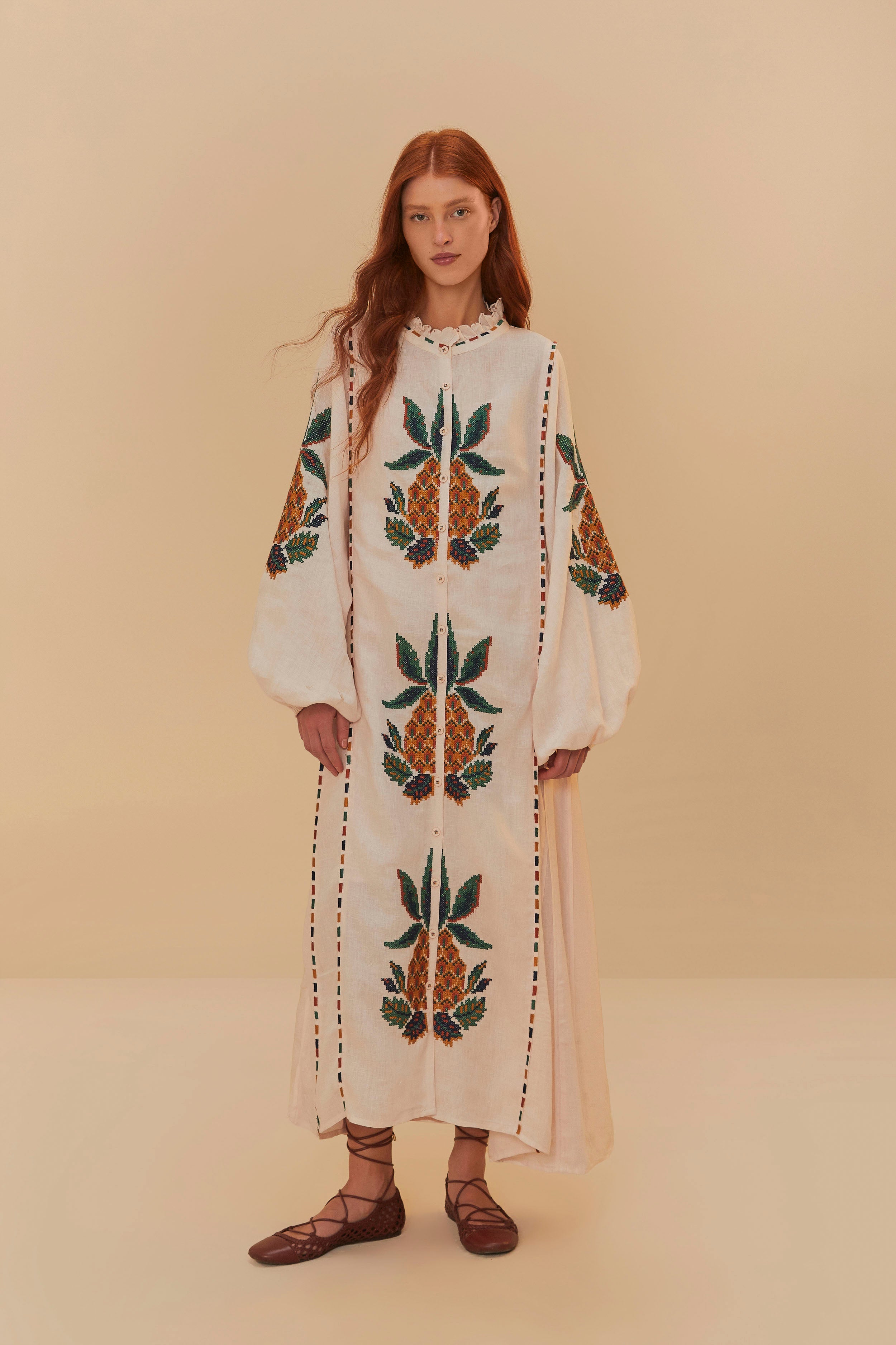 فستان طويل مطرز بالأبيض والأسود بأكمام طويلة