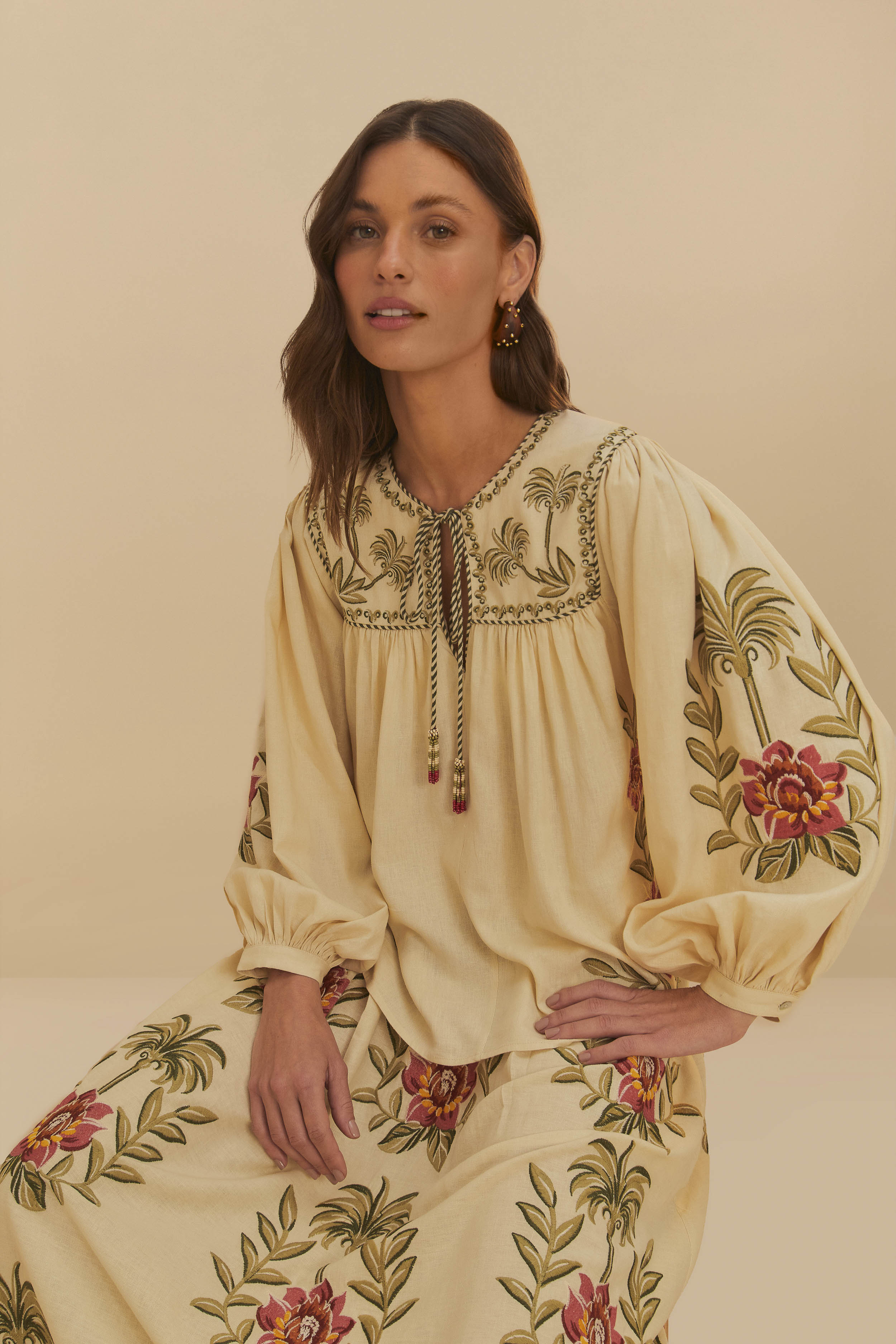 بلوزة بيج مطرزة بنقشة زهور استوائية