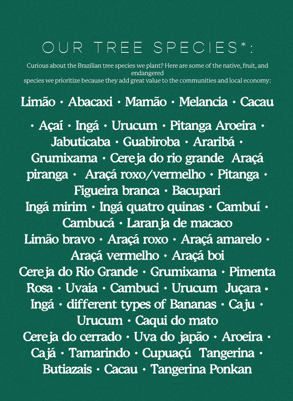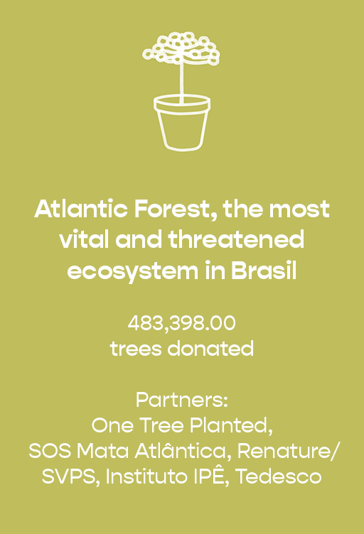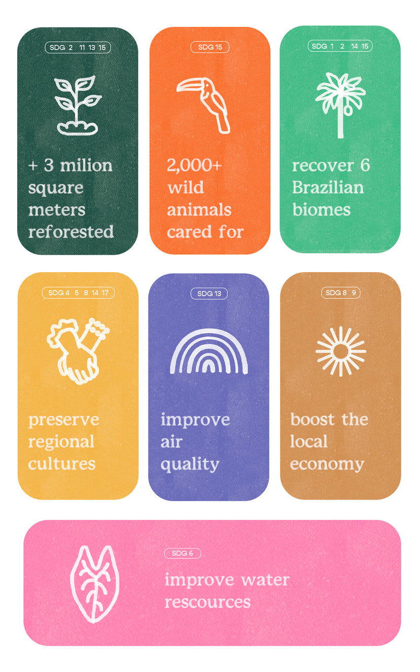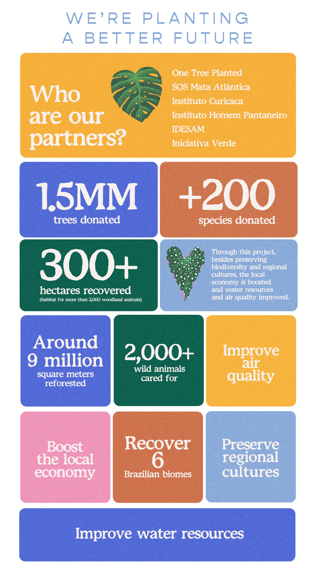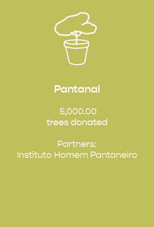 We started planting trees a few years ago in Brasil, our home country, in the Atlantic Forest and the Amazon Rainforest with our partners SOS Mata Atlântica Foundation and the Institute for Conservation and Sustainable Development of the Amazon - IDESAM, respectively. After that, we've also partnered with One Tree Planted, Instituto Curicaca, Instituto Homem Pantaneiro, and Iniciativa Verde to scale these initiatives even more, embracing all the other biomes. Together, we work to regenerate degraded soils through the planting of native species, boost local culture and economies, neutralize emissions, and recover our important biodiversity while protecting the environment. We help show that agriculture and the forest can coexist in harmony through plantings made in agroforestry systems.
