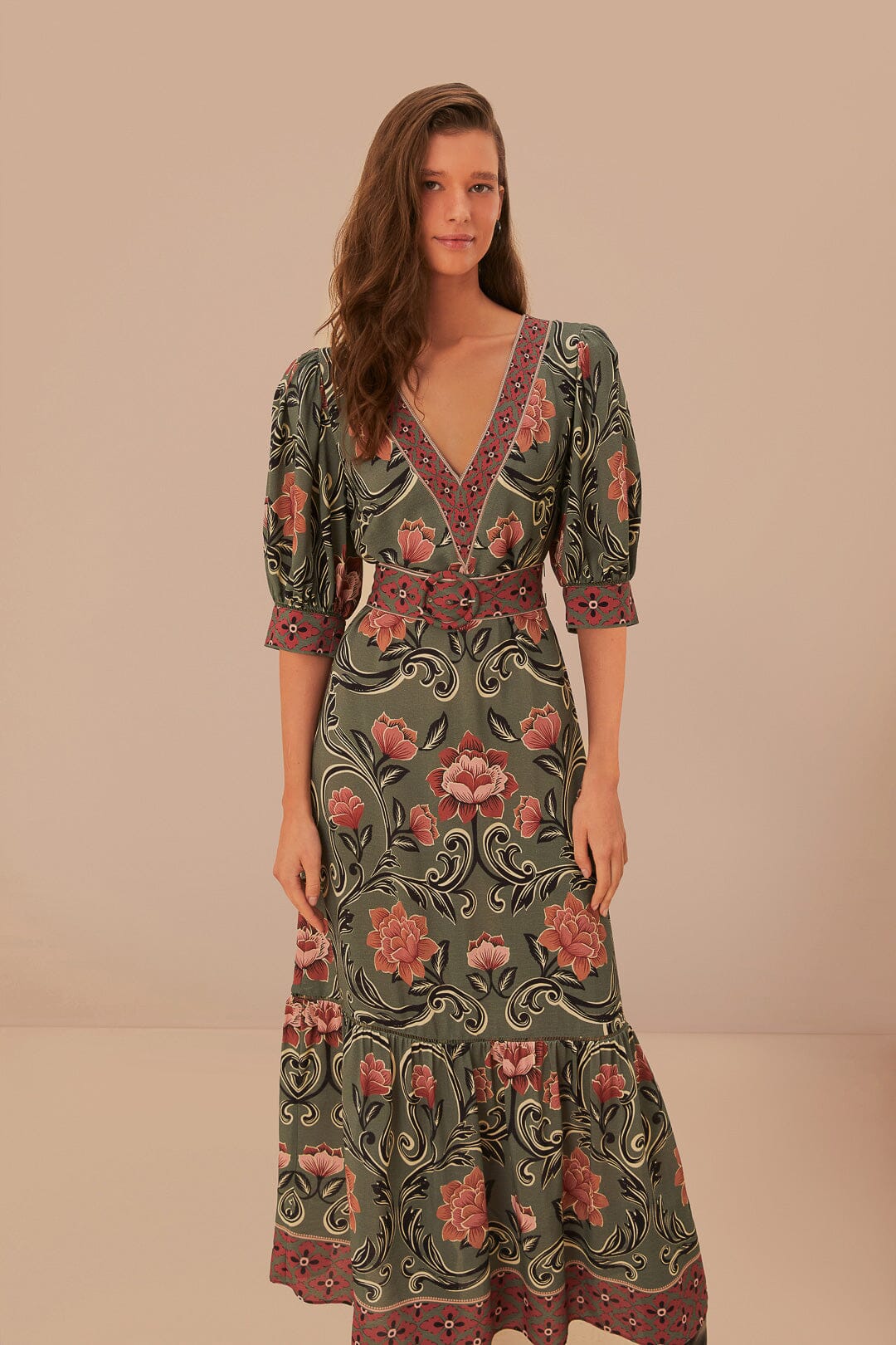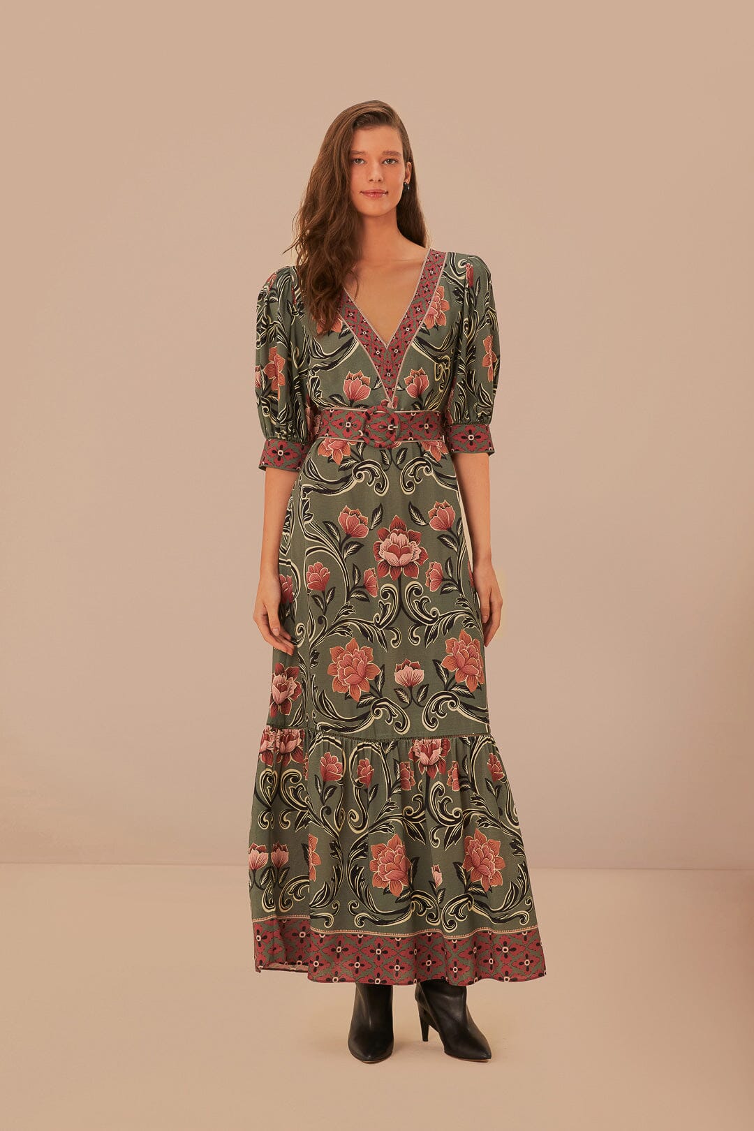 Embrace the vibrant spirit of Brazil with the Arabesque Floral Green Maxi Dress by FARM Rio. This enchanting piece features a playful V neckline and a flowy silhouette that dances with every step. Adorned with a captivating floral pattern in lush green hues, this dress is perfect for making a bold, yet effortlessly chic statement. The intricate details and unique design make it a must-have addition to your wardrobe, radiating an aura of tropical elegance.