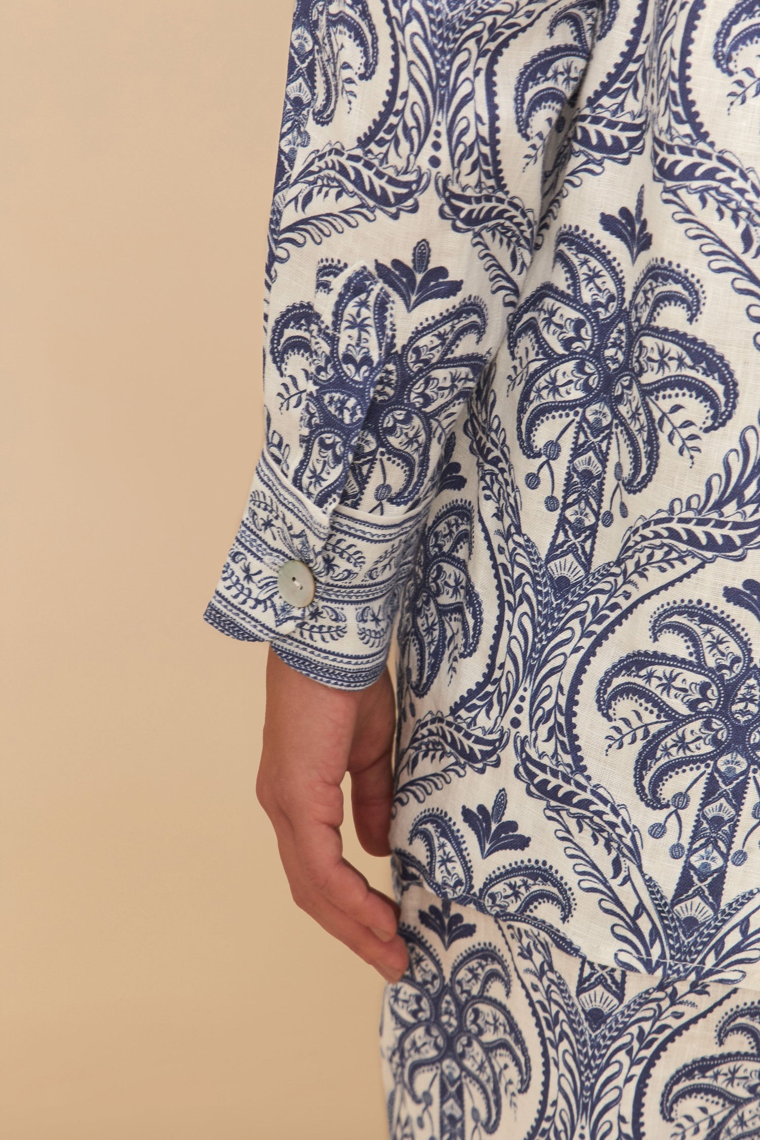Immerse yourself in laid-back sophistication with the Off-White Tropical Cameo LENZING™ ECOVERO™ Euroflax™ Pajama Shirt. This shirt features a playful tropical print in calming blue hues, gracefully flowing over its relaxed silhouette. The collar neckline adds a touch of classic elegance, beautifully balancing the vibrant pattern. Crafted from responsible materials, it's a delightful blend of comfort and charm, perfect for a breezy day.