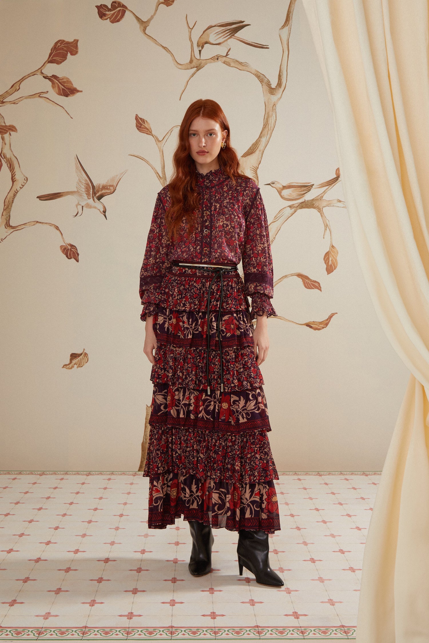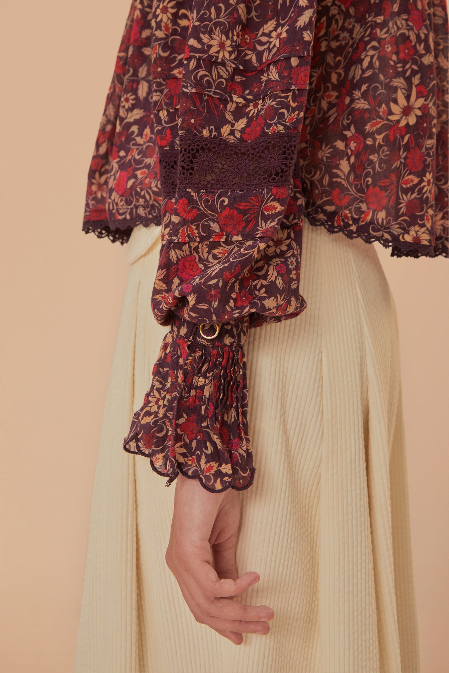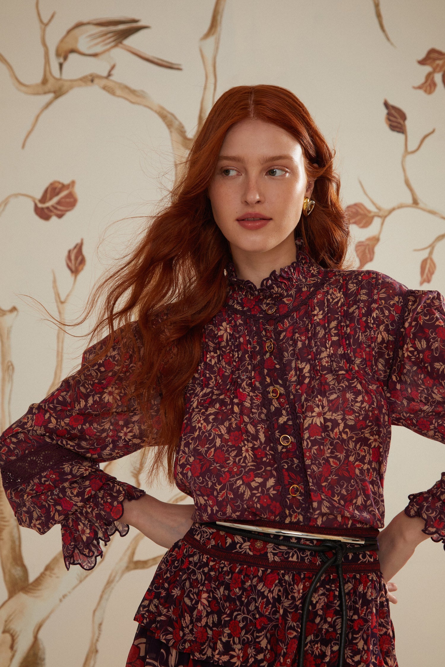 Discover the enchanting charm of the Purple Chelsea Garden Long Sleeve Blouse, adorned with a vibrant tapestry of florals in rich purples and warm earth tones. Crafted with a delicate high neckline and gently puffed sleeves, this piece cascades into elegant ruffle accents, creating a silhouette that's both refined and effortlessly romantic. Perfect for twirling through your day or a magical evening out, this blouse is a dreamy addition to any wardrobe.