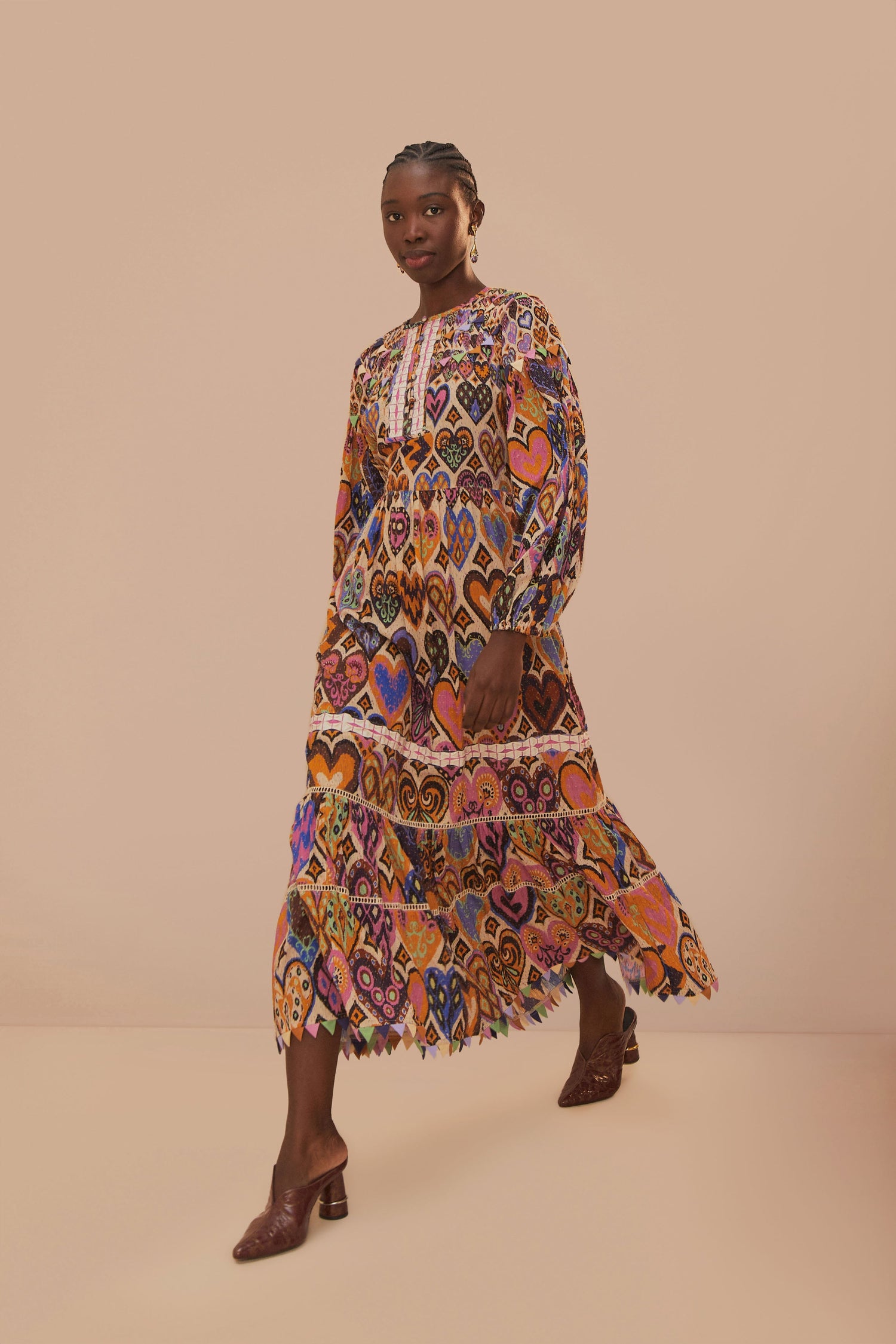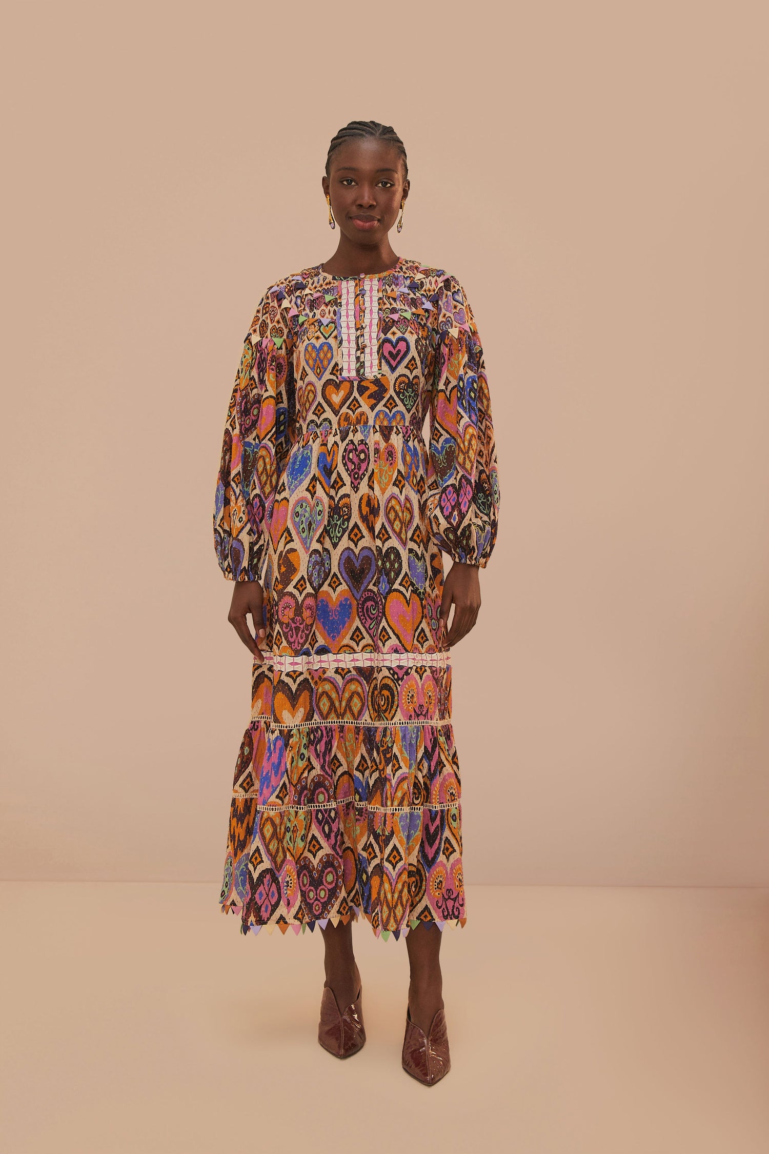 Embrace the vibrancy of the Cream Hearts Ikat Long Sleeve Maxi Dress, where traditional Ikat patterns blend with a cascade of heart motifs in a symphony of rich oranges, purples, and pinks. This dress features a round neckline and a relaxed silhouette that gently flares to a tiered hem, creating a dance with every step. The long, billowy sleeves add an air of bohemian elegance, perfect for sun-drenched days and balmy evenings alike.