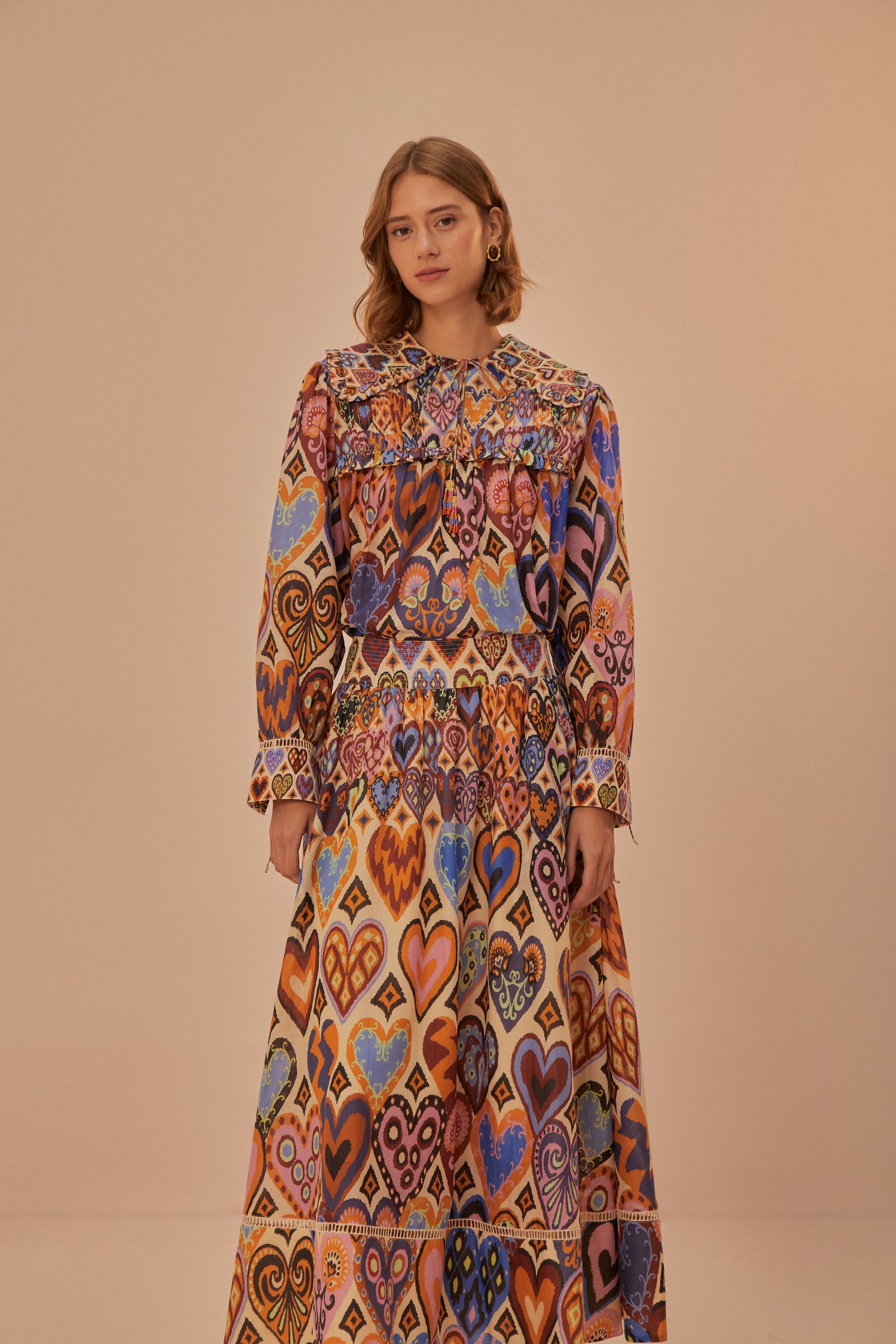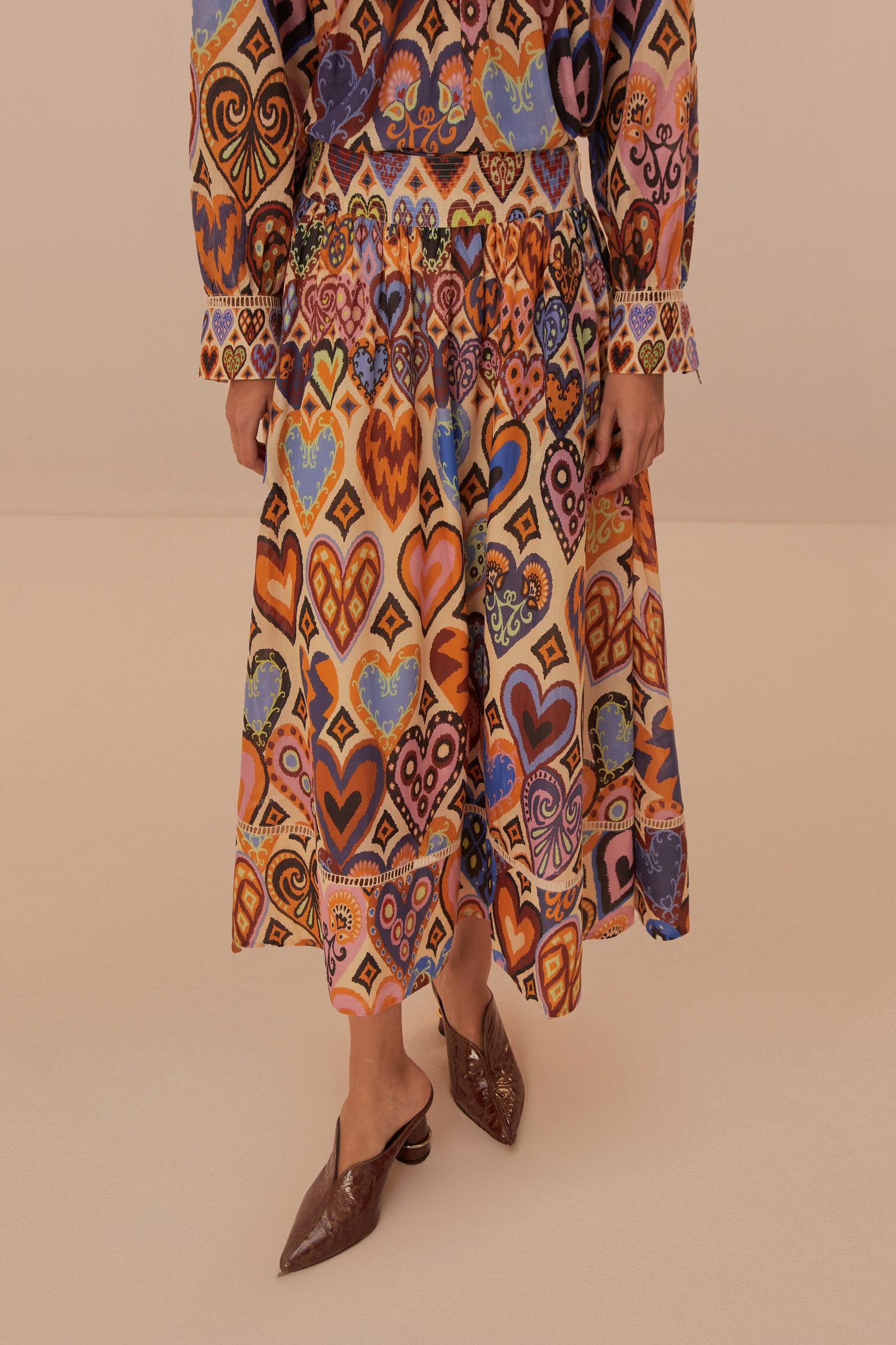 Embrace the charm of the Cream Hearts Ikat Midi Skirt, where traditional ikat intertwines with a playful heart pattern in a kaleidoscope of colors. Each swish of this free-flowing silhouette reveals thoughtful details in warm cream, amber, and cobalt hues. The skirt's gentle pleats and midi length create a fluid, feminine profile, perfect for those who adore unique artistry in their wardrobe.