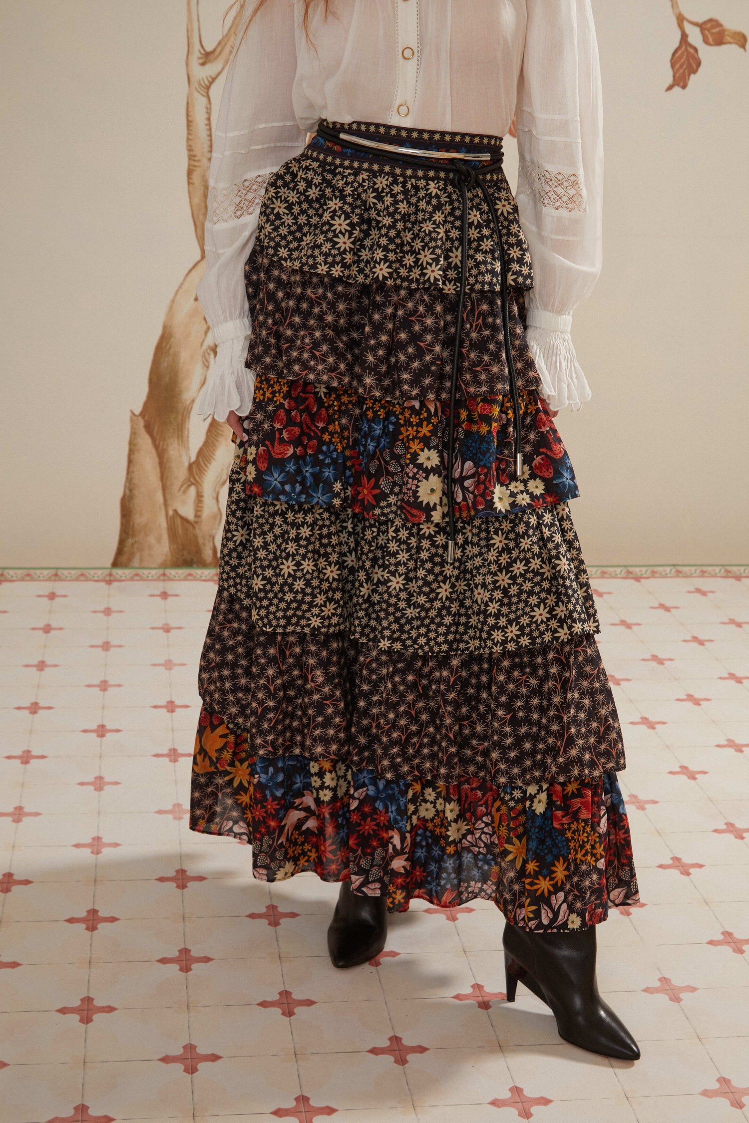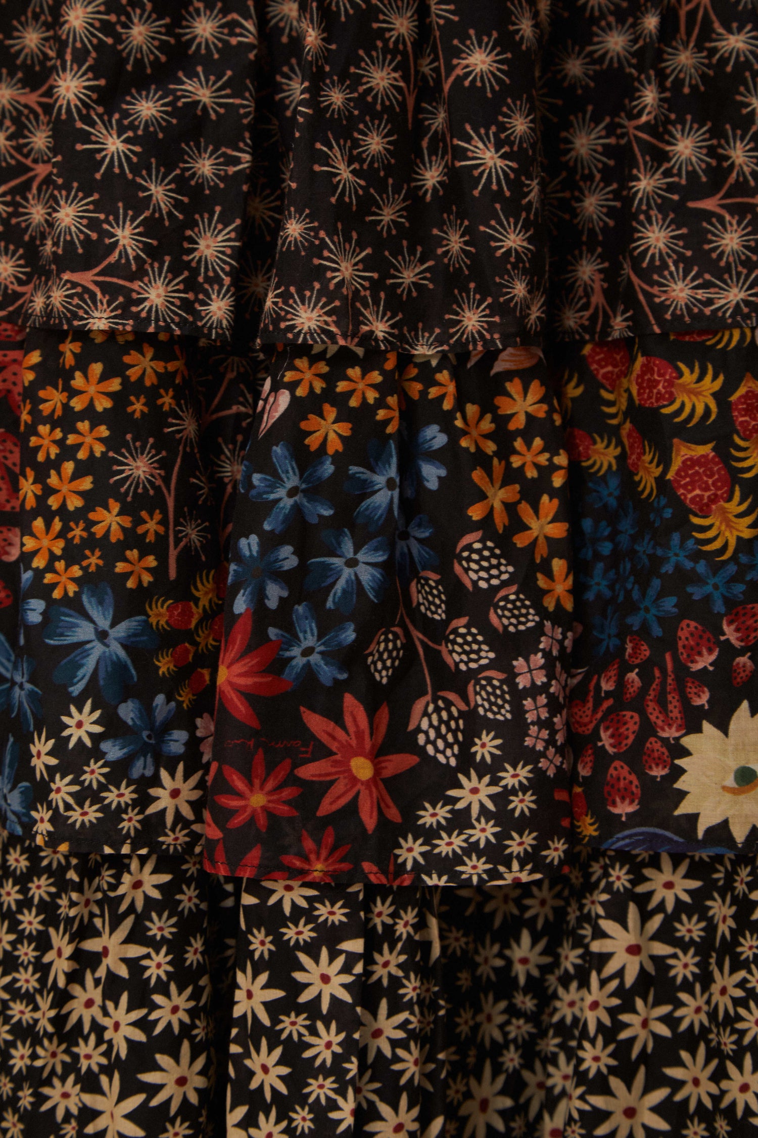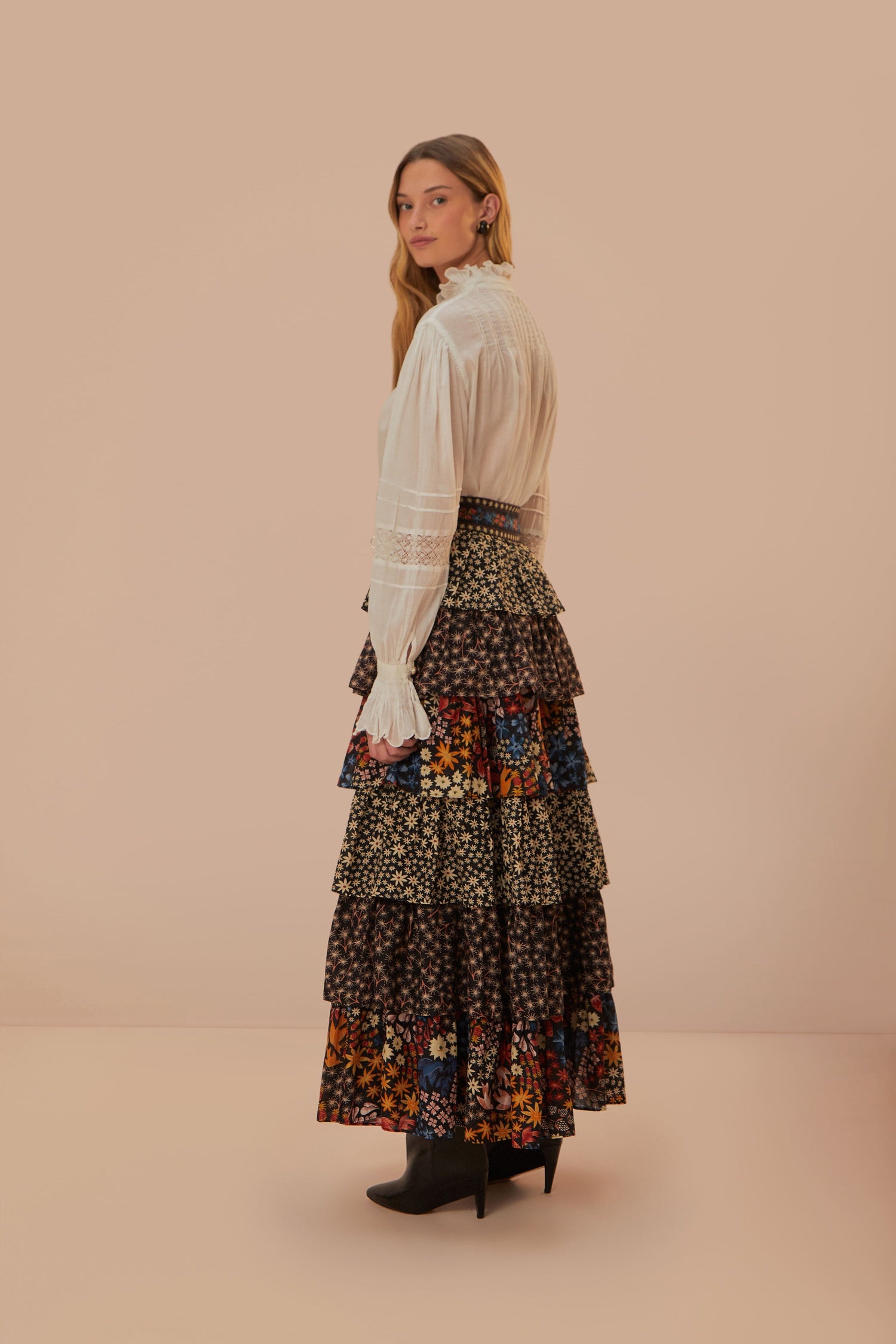 Wrap yourself in the enchanting charm of the Black Jujus Garden Midi Skirt, where vibrant bursts of florals bloom against an alluring black backdrop. Tiered ruffles dance gracefully at each step, crafting a silhouette that speaks to the free spirit. The fluid movement and captivating pattern make this piece a poetic addition to your wardrobe, invoking the lush elegance of a midnight garden stroll. Embrace this unique blend of whimsy and sophistication for your next cherished outing.