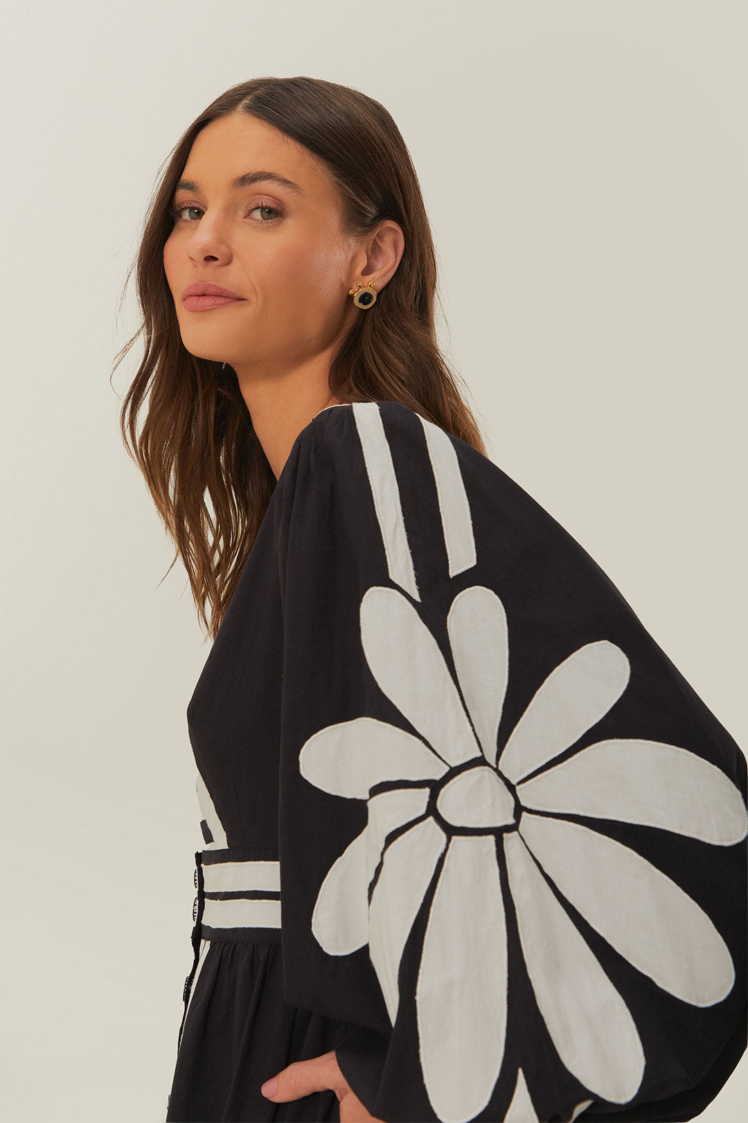 Discover the enchanting elegance of the Black Nature Buttoned Maxi Dress, a captivating piece that blends the allure of a deep black canvas with striking white floral and geometric accents. The flowing silhouette with a V neckline and billowing sleeves lends a touch of bohemian sophistication, while the bold patterns evoke the beauty of natural simplicity. Step into a world of charm and grace with this unique maxi dress, perfect for creating unforgettable moments.