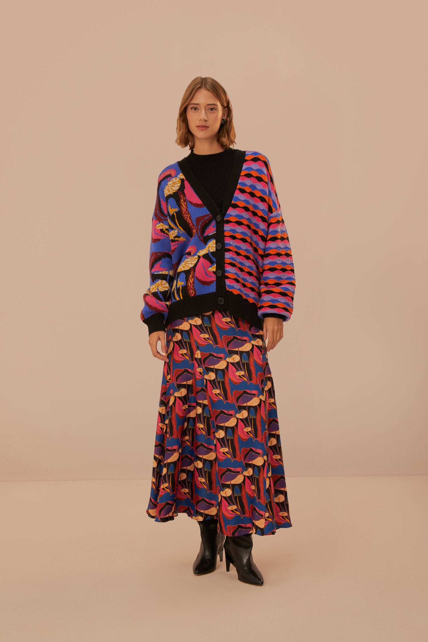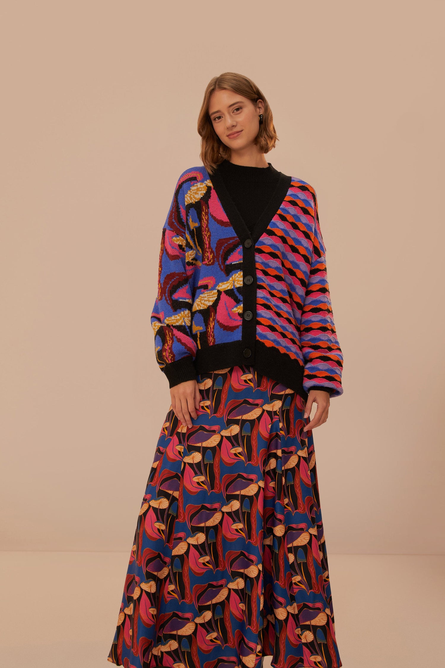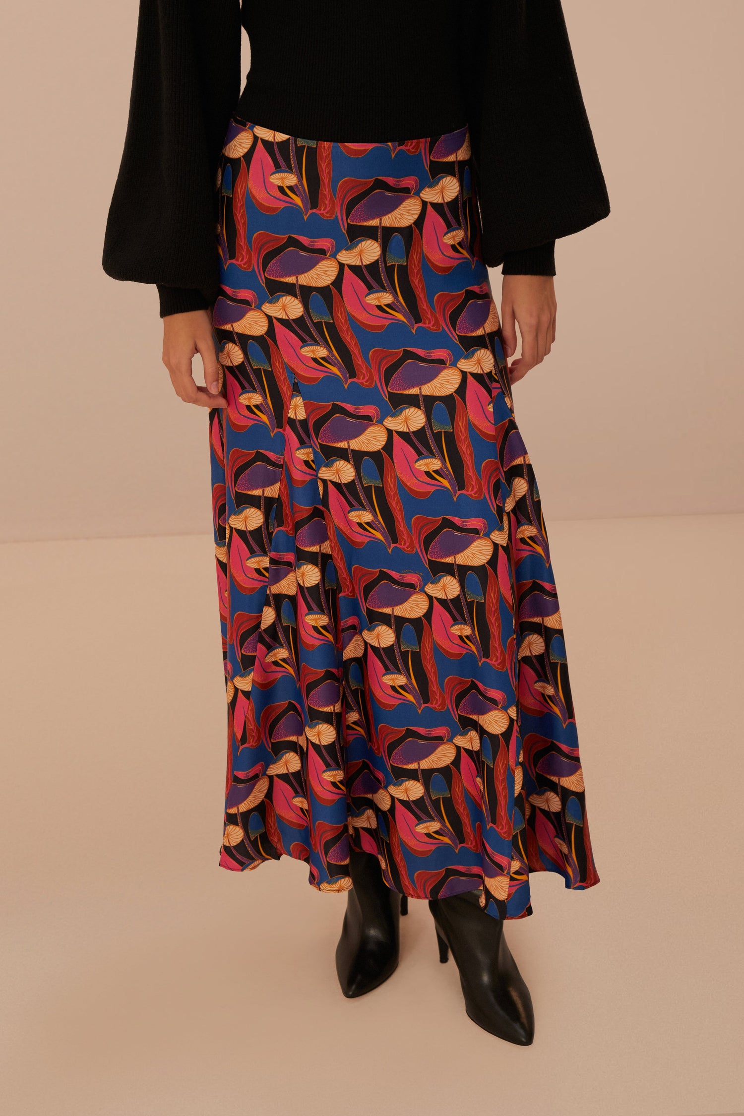 Embrace the enchanting flair of the Wild Mushrooms Black Maxi Skirt, crafted from materials chosen with care. Dance through your day with its whimsical mushroom print in warm earthy tones set against a rich black canvas. The flowing maxi length coupled with a playful flair creates an effortlessly elegant silhouette, perfect for both daydreams and twilight soirees. This piece from FARM Rio brings a touch of magic to every moment. LENZING ECOVERO: the eco-responsible fibers generate up to 50% lower emissions and water impact compared to generic viscose.